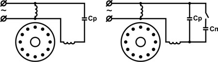 Для того, чтобы однофазный элеткродвигатель обладал характеристиками максимально приближенными к трехфазному электродвигателю в его статоре необходимо создать вращающееся магнитное поле максимально приближенное к круговому. Это достигается правильным подбором емкости рабочего конденсатора в зависимости от тока в обмотке. Но так как пусковой и рабочий токи существенно различаются, то один рабочий конденсатор не в состоянии обеспечить идеальное магнитное поле во всех режимах работы однофазного электродвигателя. В обычных однофазных электродвигателях конденсатор подбирается для номинального тока. Соответственно его емкости недостаточно при пуске и такой однофазный электродвигатель имеет пониженный пусковой момент.